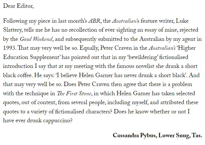 Get a load of these letters to the editor in the Australian Book Review in June 1995. Cassandra Pybus had written a critical review of The First Stone that opened with an anecdote about she and Garner having coffee together. Then other people criticised Pybus. This is Pybus’ response: