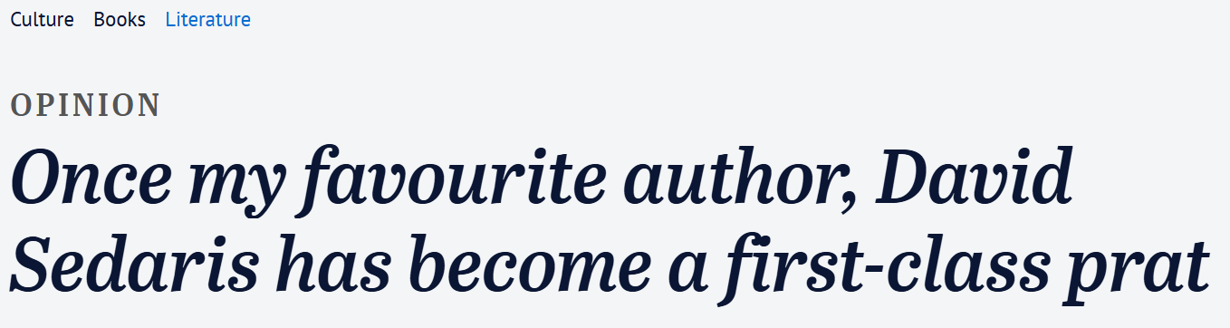 When it comes to mega literary talent like David Sedaris, there are very few angles for a ‘hot take’. Sedaris has made a critically-acclaimed fortune from mining his own life’s embarrassing details, so there’s no dirt he himself hasn’t already dished. He doesn’t need to do interviews for publicity because he’s popular enough to sell out his own shows. But he’s visiting Sydney, right? So the SMH want to cover it in some way. The result is this headline. And shame on me for clicking on it.